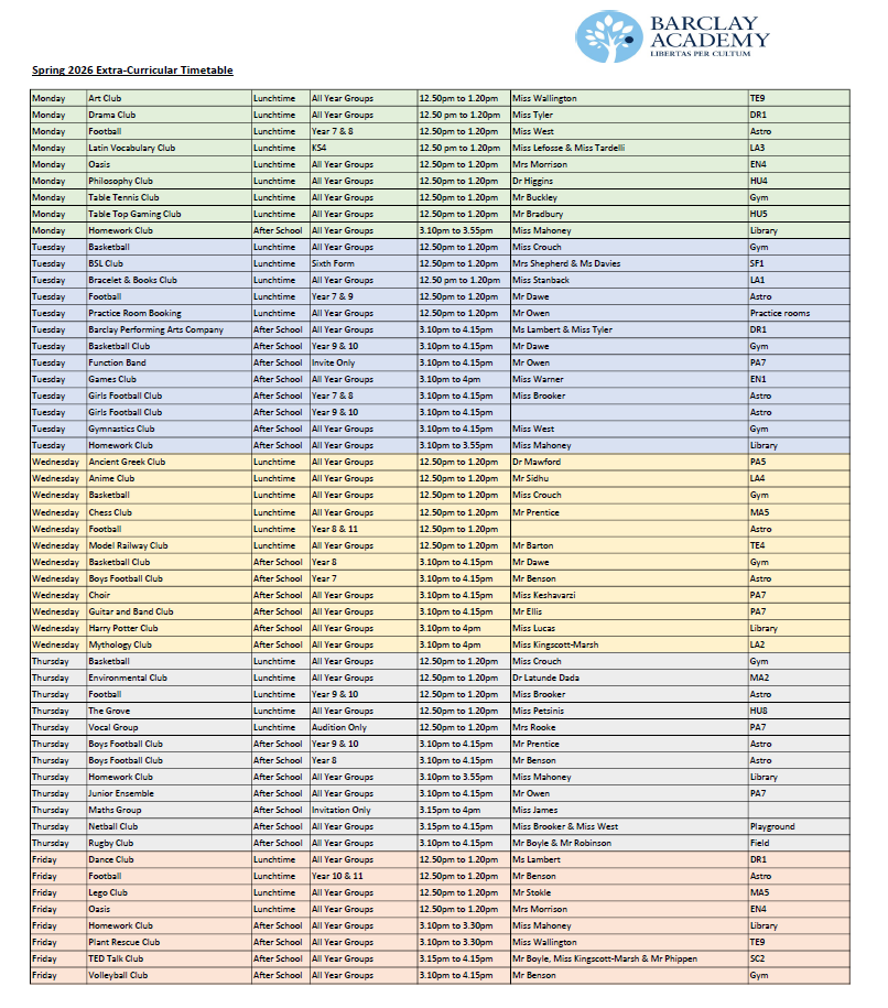 We are proud of the wide range of different societies and clubs on offer which run before school, during lunchtime and after school. Pupils are provided with the opportunity to participate in a variety of sports across the week at both lunchtime and after school. Sports offered across the year include football, netball, hockey, table tennis, volleyball, basketball, gymnastics, cheerleading, cricket and rounders. Pupils are provided with the opportunity to compete in sports against other schools at both district and county events. Pupils who prefer to participate for fun are given the opportunity to participate recreationally in their favourite sport each week. Pupils are also encouraged to try a new sport, with our clubs being open to all pupils. Barclay Academy timetable for societies and clubs can be viewed here.